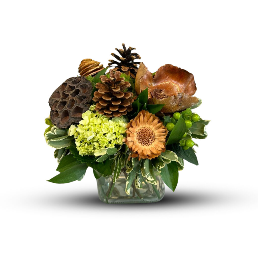 Earth tones abound! This woodsy arrangement is painted in shades of greens and browns furnished with long-lasting dried accents.
